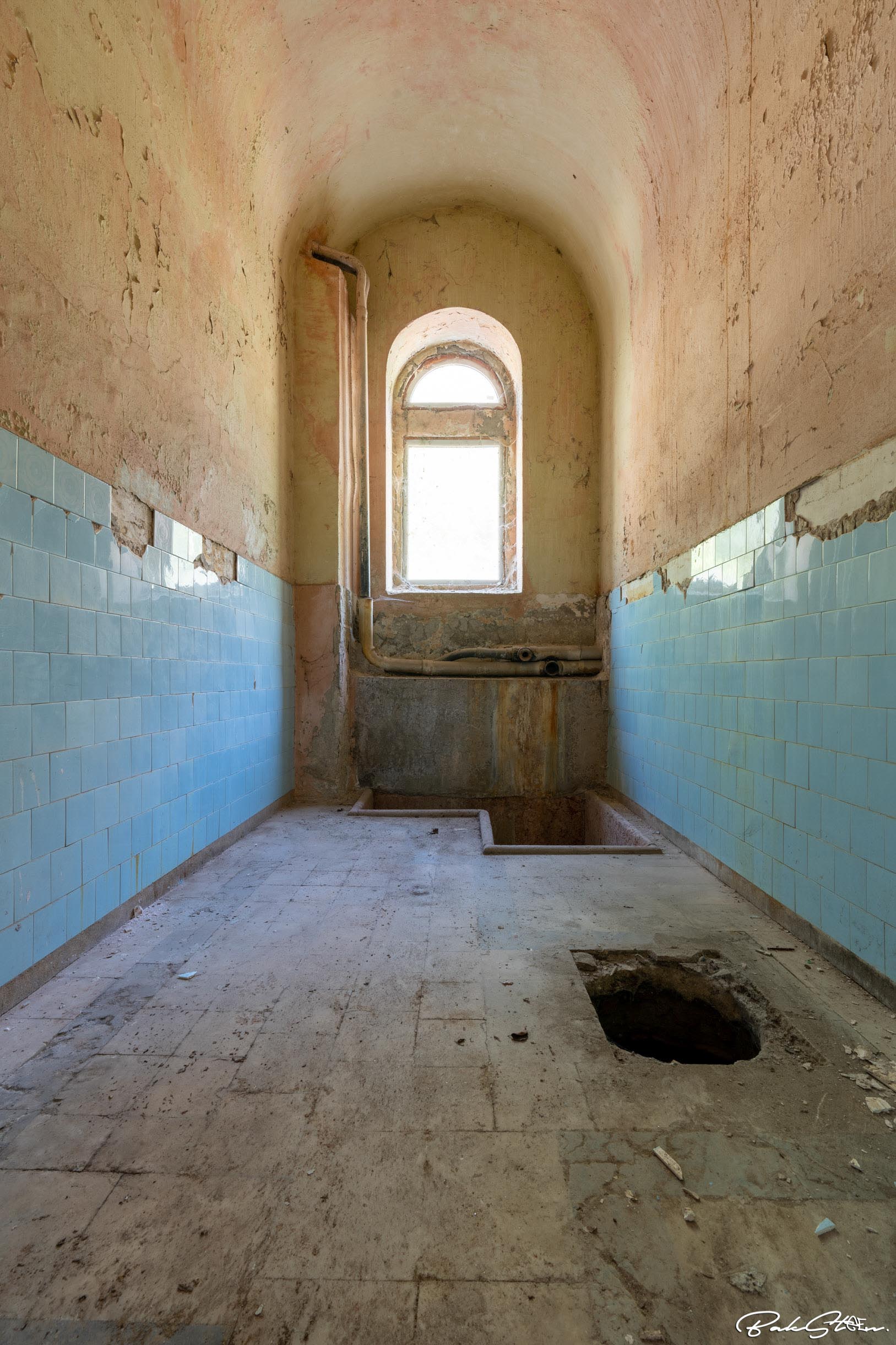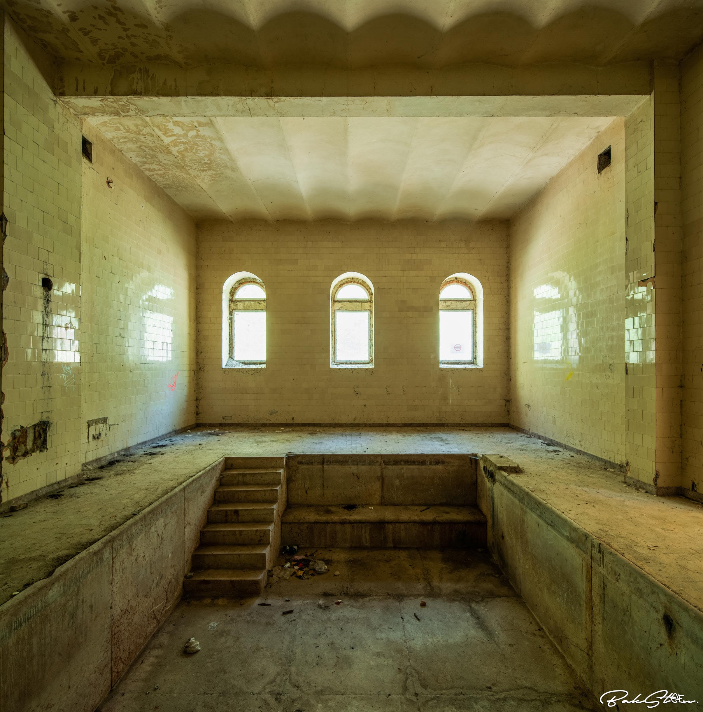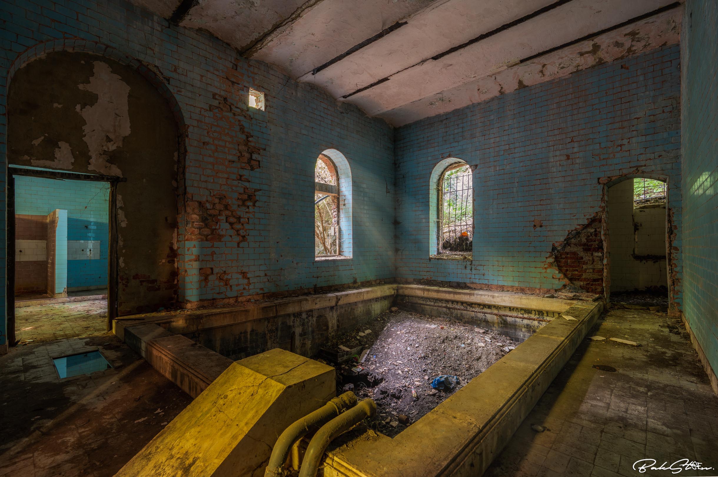Definitely the most impressive abandoned bathhouse I’ve ever entered. Actually, I’ve visited the location three times in 24 hours. This because the first time somebody told us to leave. The second time the sun was too bright. The third time I finally succeeded. It took me a lot of effort, but all worth it of course.
